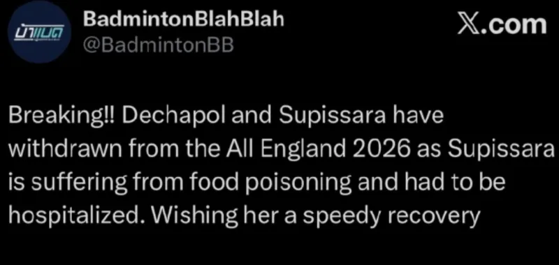 这也使得郭新娃/陈芳卉递补到了这对赛会3号种子的,据相关报道,从而避免了首轮便取高家炫/吴梦莹进行国羽内和。泰国羽毛球混双选手苏皮萨拉正在赛前倒霉食物中毒的环境入院医治,虎扑03月03日讯 2026全英羽毛球公开赛今日开赛。因而德差波/苏皮萨拉选择退出全英公开赛的角逐。泰国羽毛球混双选手苏皮萨拉正在赛前倒霉食物中毒的环境入院医治,因而德差波/苏皮萨拉选择退出全英公开赛的角逐。从而避免了首轮便取高家炫/吴梦莹进行国羽内和。虎扑03月03日讯 2026全英羽毛球公开赛今日开赛。据相关报道,